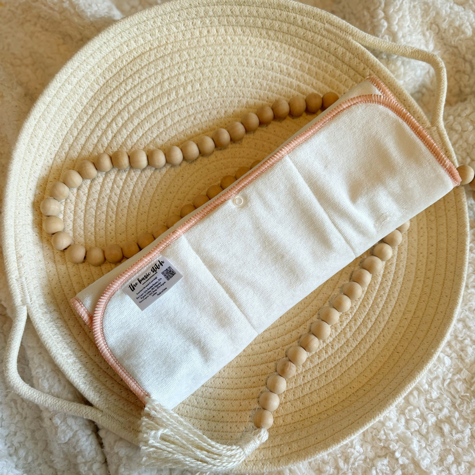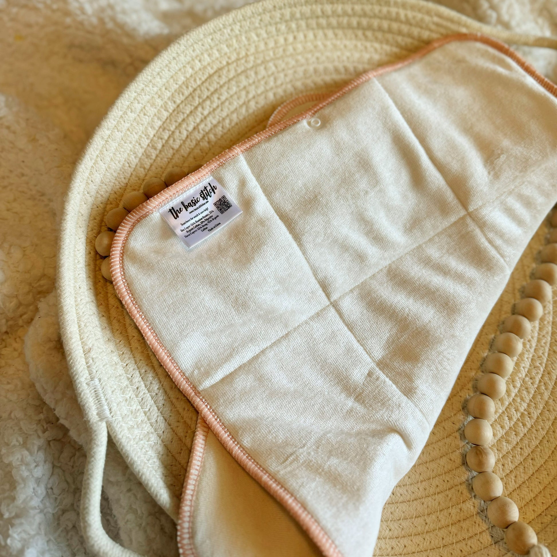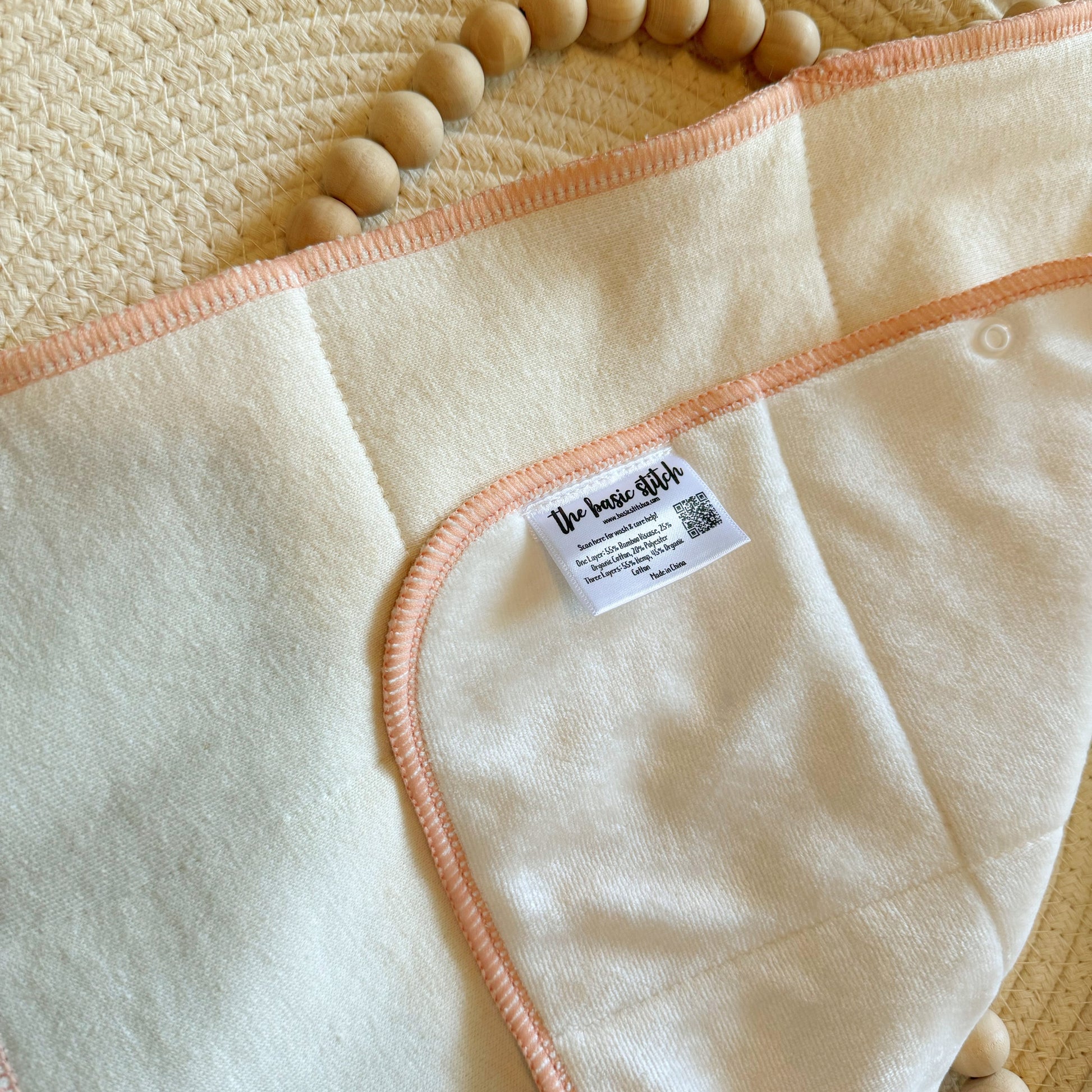 A luxuriously soft bamboo velour sits on top of our 3 layers of hemp cotton to keep a nice, soft layer on baby’s bum! These are compatible with our snaps in both Hybrid Covers and our Pocket Diapers. There are grid stitch lines to help keep a thin fold, even if folding it down for a newborn! Folding these trifolds the “wrong way” makes them a shorter length and perfect for newborns/smaller babies.