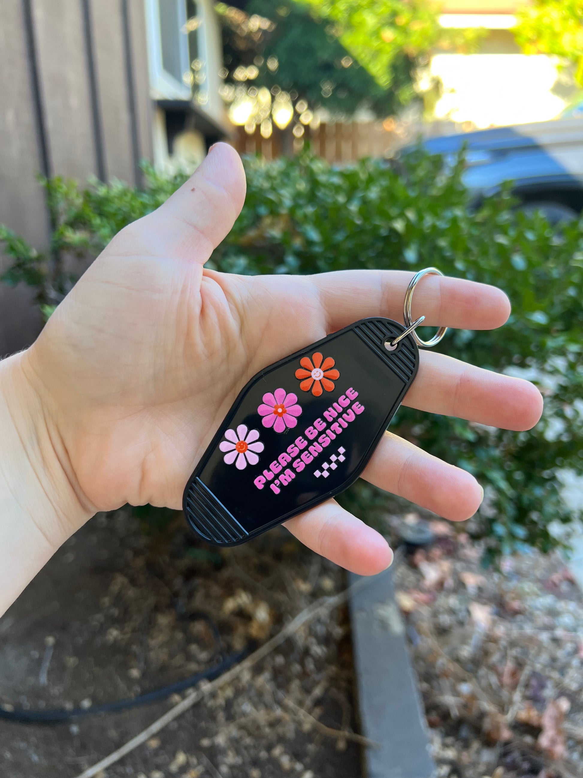 “I’m Sensitive” Motel keychain with UV DTF design.