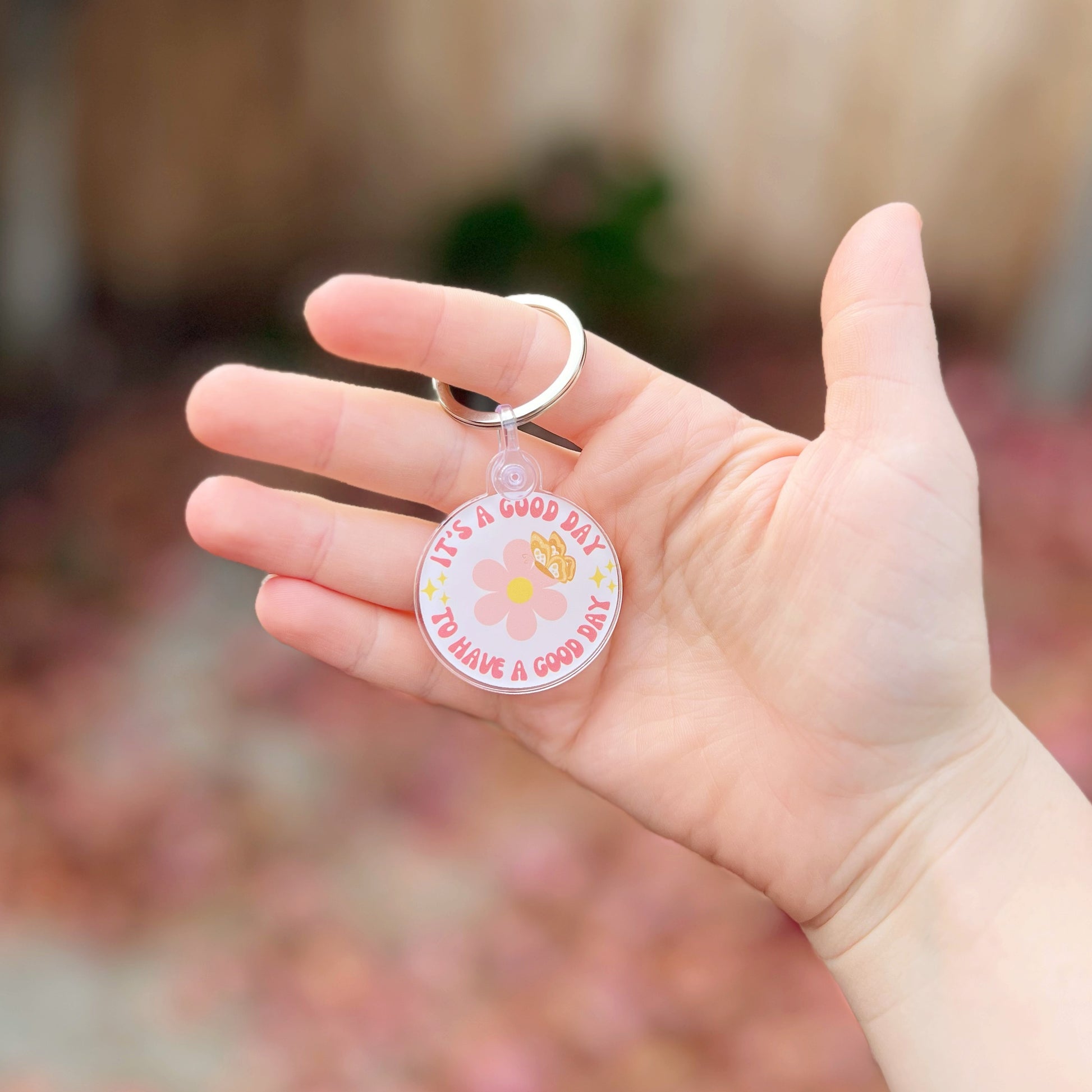 “It’s a Good Day To Have a Good Day” keychain, about 1”x1”. Peel protective film when you receive it!