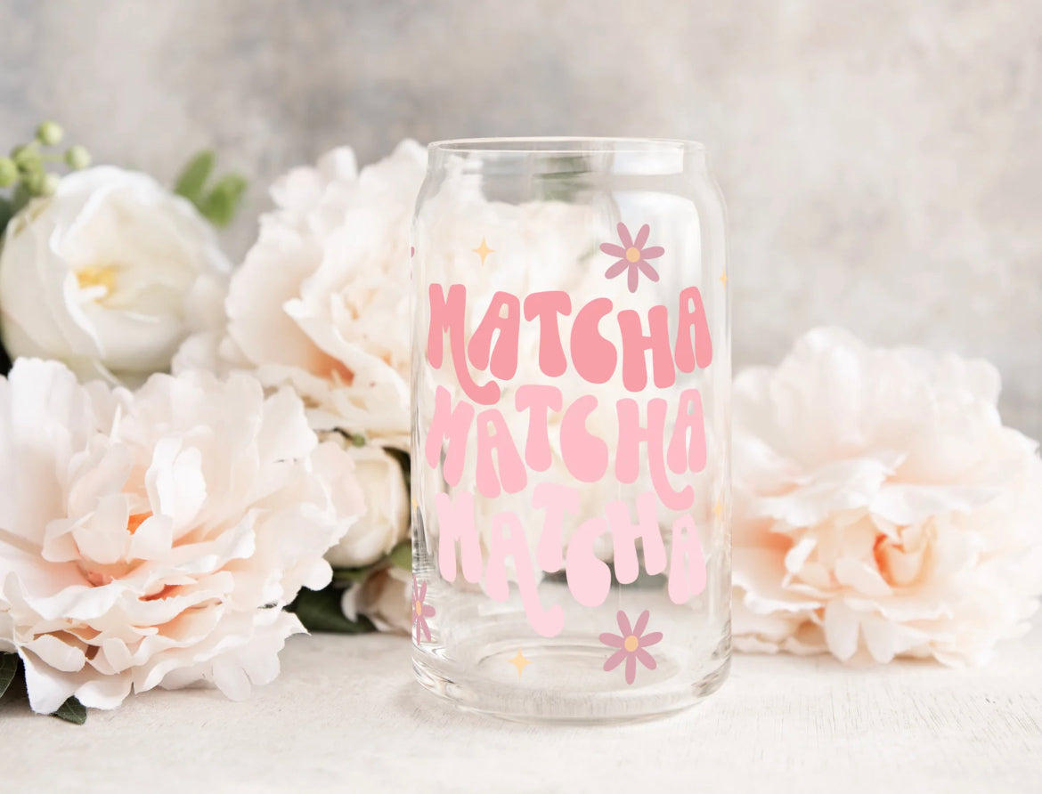 Matcha 16oz glass can tumbler with black metal straw and bamboo lid. Great for cold beverages!