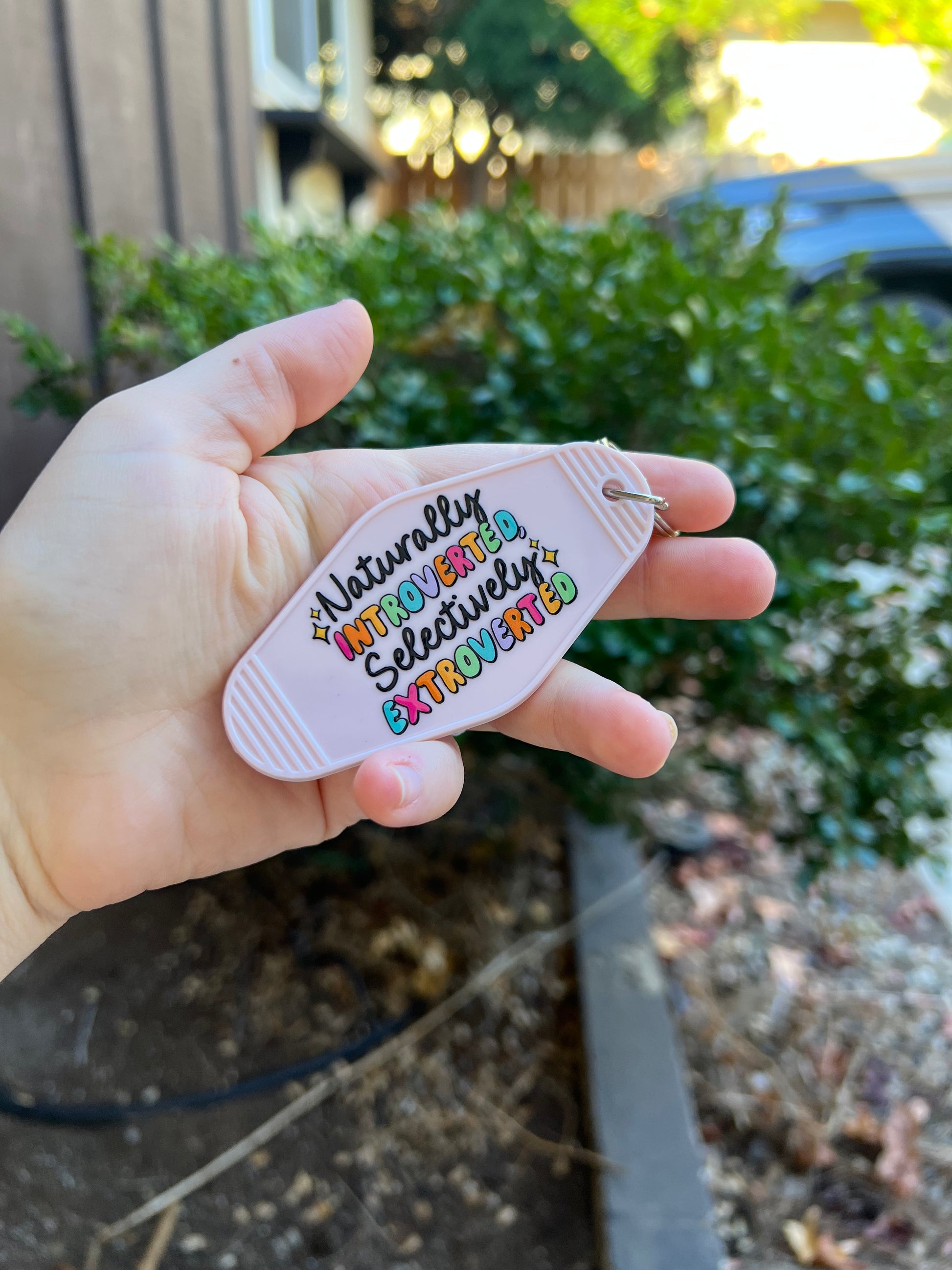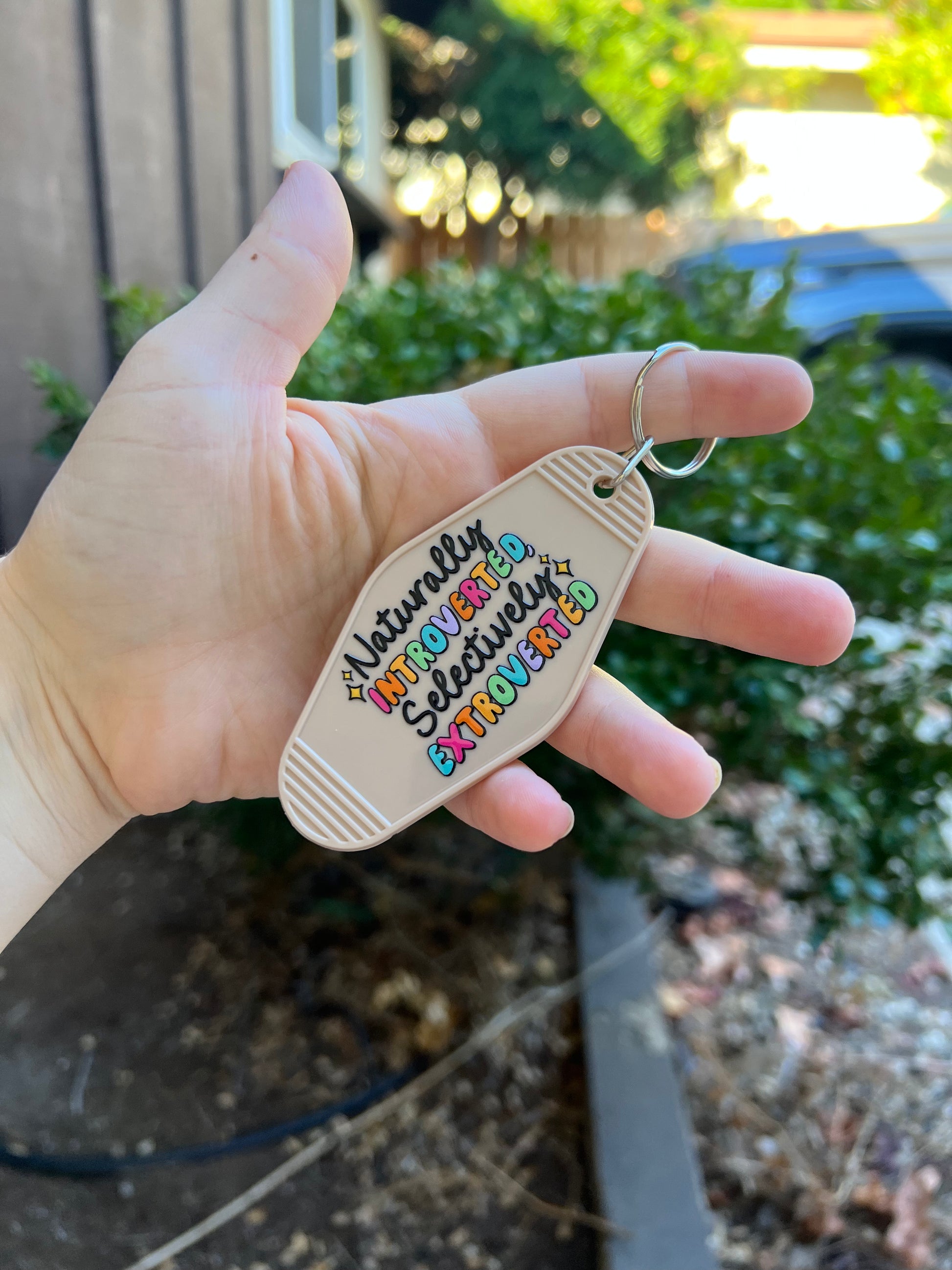 “Naturally Introverted” Motel keychain with UV DTF design.
