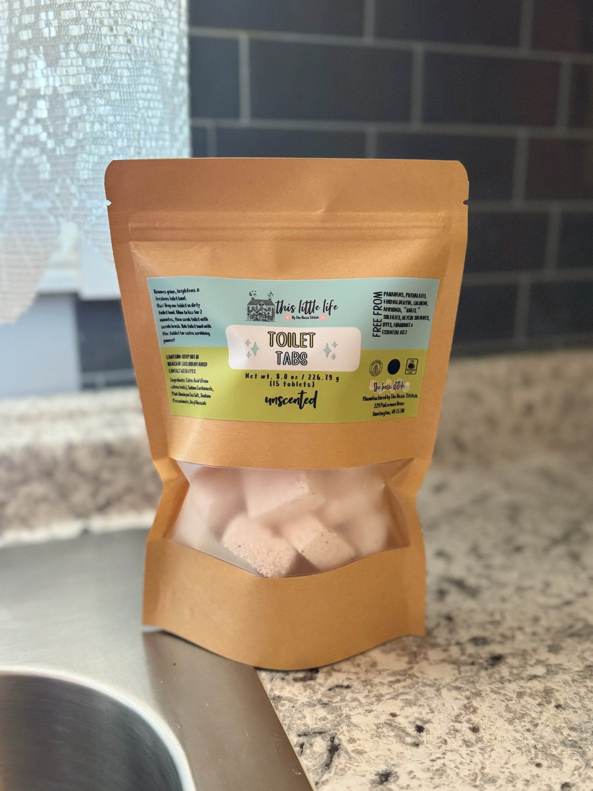 Toilet Tabs (Unscented, 8oz/226.79g net wt, 15 tablets) Ingredients: Citric Acid (from citrus fruits), Sodium Carbonate, Pink Himalayan Sea Salt, Sodium Percarbonate, Decyl Glucoside